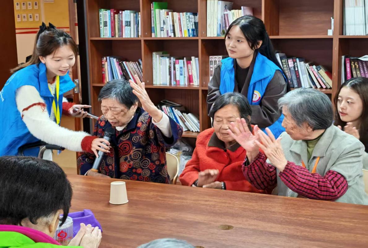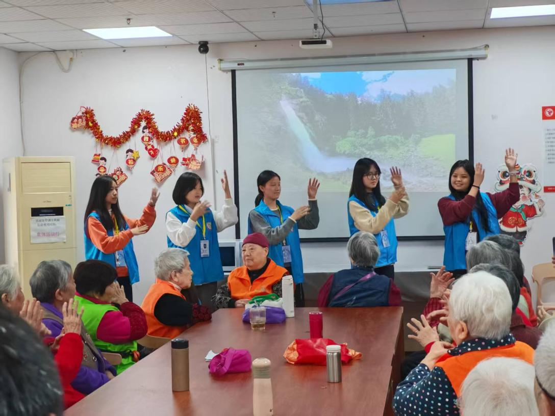 活动现场,志愿者们纷纷献出了各自准备好的表演,一首《最炫民族风》点燃现场,在“手势舞教学《美丽中国》”环节中,志愿者们站在台前示范手势,老人们纷纷抬手模仿,动作虽略显迟缓,却满是认真与笑意;在歌唱环节中,志愿者扬起了清亮的嗓音“好一朵美丽的茉莉花,又香又白,人人夸......”志愿者们的歌声里,有青春的蓬勃温度,更有晚辈对长辈最真挚的抚慰,活动室里瞬间被歌声与掌声填满,暖意融融。