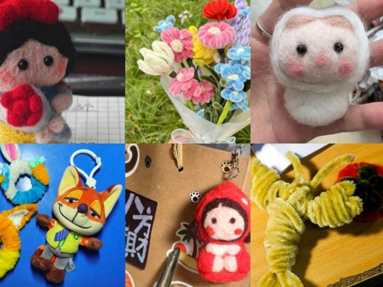 活动现场暖意融融,两栋楼的同学们热情高涨,纷纷化身“创意匠人”,围坐在一起开启手工创作之旅。羊毛戳戳乐专区内,大家手持戳针,专注地将蓬松的羊毛一点点塑形,软萌的小熊、灵动的小兔子、精致的小挂件渐渐在指尖诞生,每一个针脚都凝聚着耐心与巧思;扭扭棒专区则尽显灵动活力,彩色的扭扭棒在同学们的手中缠绕、弯折、拼接,转眼就变成了色彩鲜艳的花束、呆萌的卡通玩偶、别致的桌面摆件,创意十足。