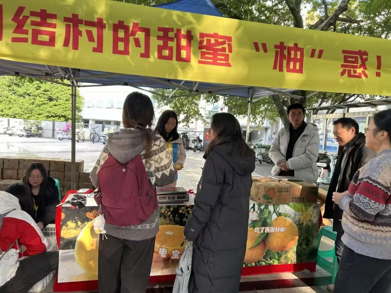 活动当天,志愿者们早早布置好摊位,将一筐筐金黄饱满的桔柚整齐摆放,并附上果农亲手写的感谢卡与种植故事。现场吸引了许多师生驻足,“这桔柚真甜!”“桔柚水分好足!”志愿者们一边热情介绍产品特点,一边讲述这些水果背后农户的辛勤劳作与乡村发展的现实需求。不少同学听完故事后,不仅自己购买,还主动与同学们分享,甚至为在家的亲人邮寄桔柚,让他们也能品尝到酸甜可口的桔柚,呼吁更多人支持。