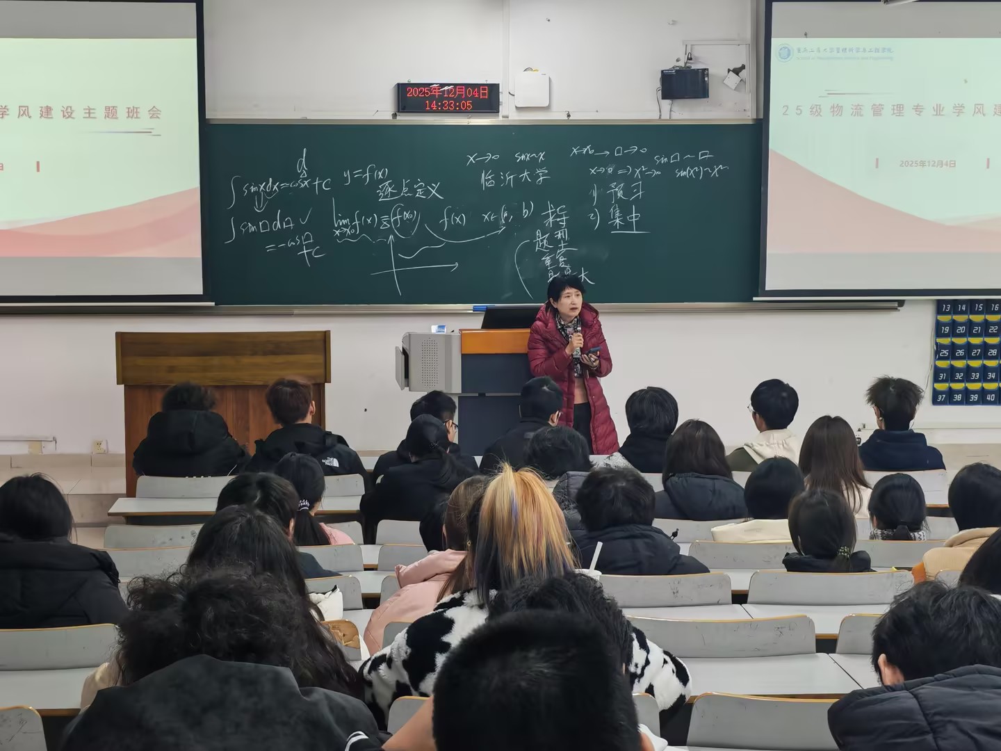 2025年12月4日,管理科学与工程学院2025级物流管理专业学业促进主题班会在博智楼7306教室顺利召开。本次班会特别邀请到数统学院张付臣教授、物流系主任龚英教授莅临指导,全体同学参会,班会由辅导员游薇老师主持。