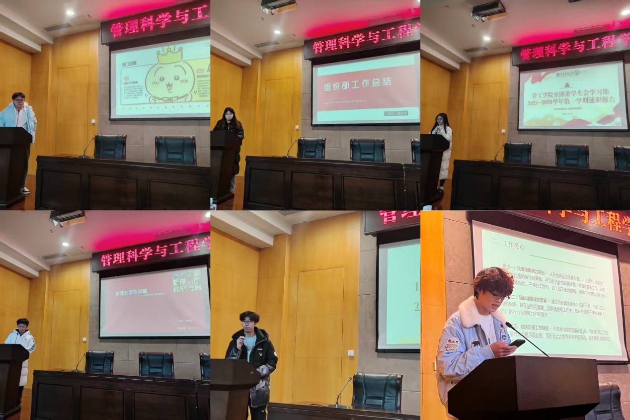 大会伊始,各部门代表依次上台,通过PPT形式作学期工作总结汇报。汇报围绕工作成果与核心数据、部门建设与内部管理、现存问题与改进方向、经验沉淀与未来规划等关键内容展开,逻辑清晰、重点突出,充分展现了各部门在学期内的务实担当与奋进姿态。