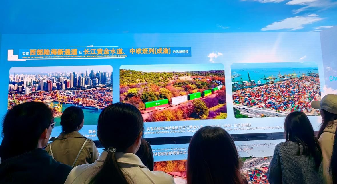 移动课堂专家交流环节,果园港公司桂明华常务副总经理和分别给同学们现场系统地分享了果园港在国家“一带一路”倡议和内陆开放高地建设、西部陆海新通道建设等国家战略中的战略定位、主要功能及其对应国际物流主要服务与主营业务,海关特殊监管区下的水果、肉类查验、通关流程与主要服务等。