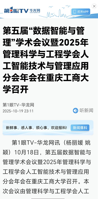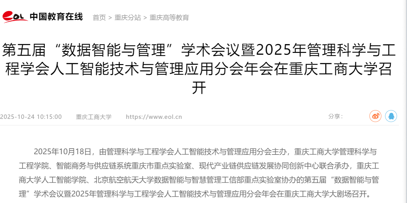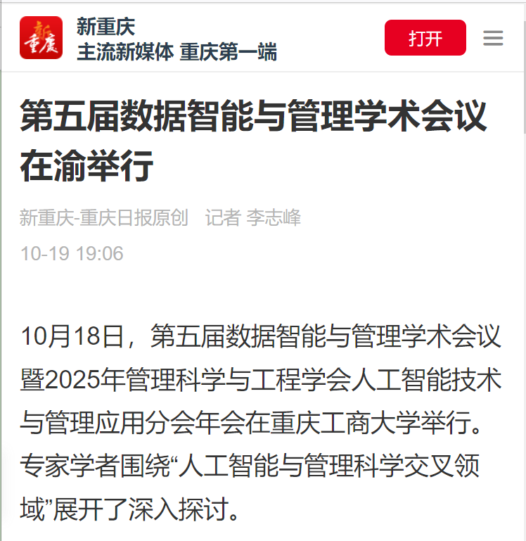 新重庆-重庆日报以《第五届数据智能与管理学术会议在渝举行》为题,中国教育在线以《“第五届“数据智能与管理”学术会议暨2025年管理科学与工程学会人工智能技术与管理应用分会年会在必赢线路检测3003召开》为题,华龙网以《第五届“数据智能与管理”学术会议暨2025年管理科学与工程学会人工智能技术与管理应用分会年会在必赢线路检测3003召开》为题纷纷报道了本次活动。